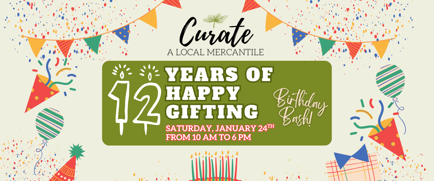 Join Curate Mercantile for a joyful birthday celebration filled with complimentary treats, giveaways, local pop-ups, and plenty of surprises on Saturday, January 24th, anytime from 10 AM–6 PM, at BOTH Curate Mercantile locations!