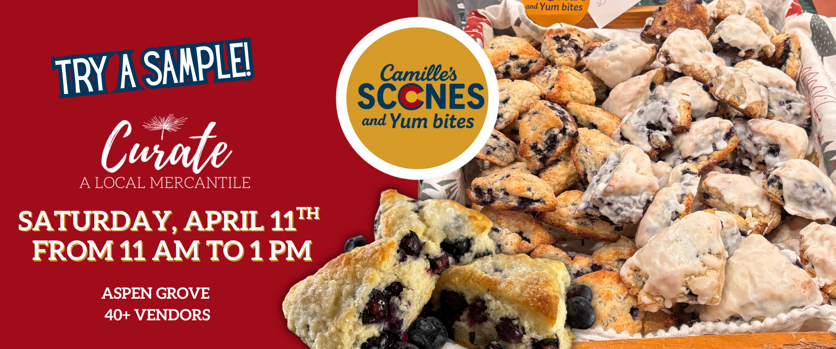 Join us at Aspen Grove as Camille’s Scones & Yum Bites hosts a delicious pop-up filled with freshly baked treats you won’t want to miss. Whether you’re a scone lover or just in the mood to try something new, this is your chance to sample and shop local.