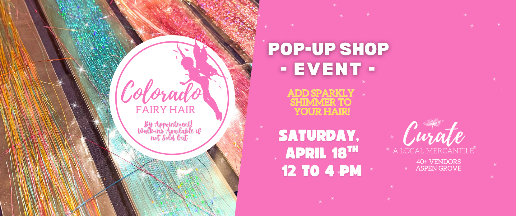 Join us at Curate Mercantile at Aspen Grove for a magical pop-up with Colorado Fairy Hair, where you can add shimmering strands to your hair for a fun, eye-catching look that lasts.