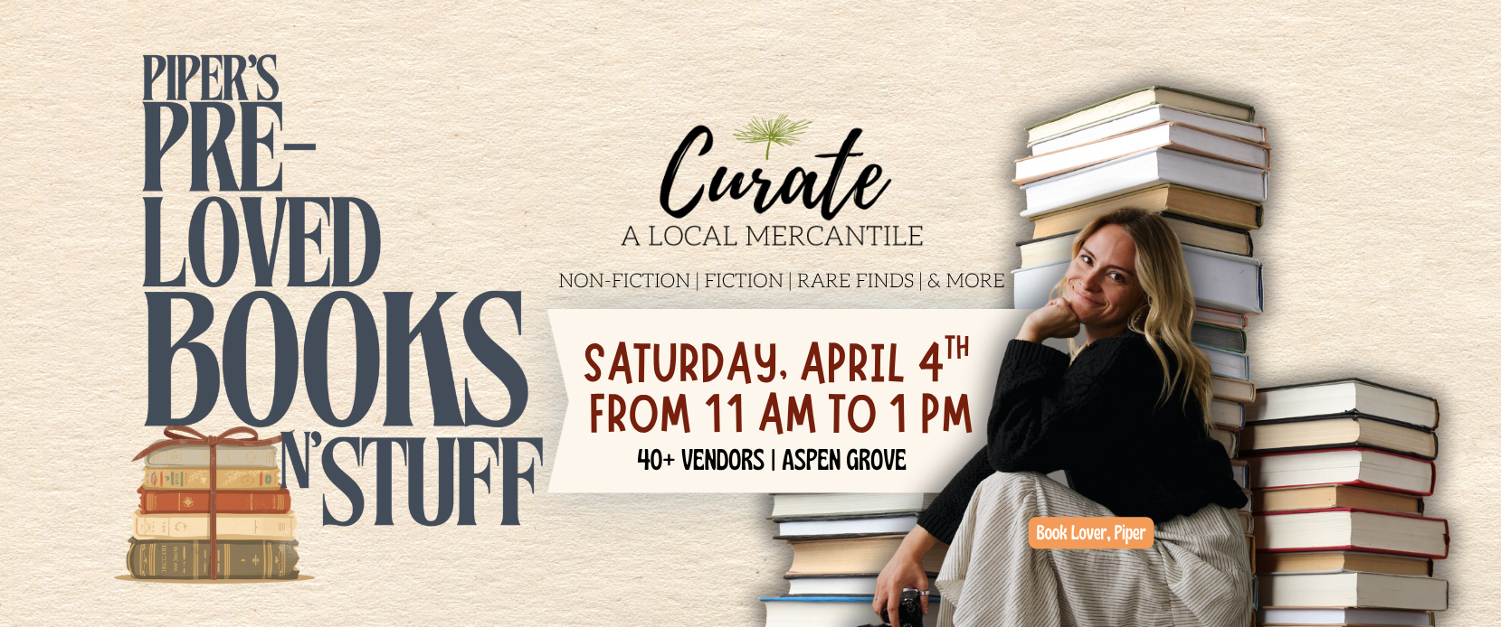 Step into Curate Mercantile at Aspen Grove for a special pop-up featuring Piper’s Pre-Loved Books ‘n Stuff—a thoughtfully curated collection of pre-loved books, rare finds, and literary treasures waiting for their next chapter.